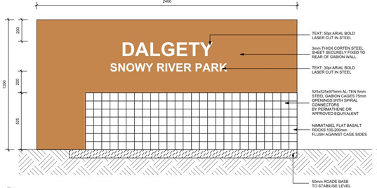 • 1 x Corten Steel Panel Feature Signage attached to gabion baskets with rock infill.